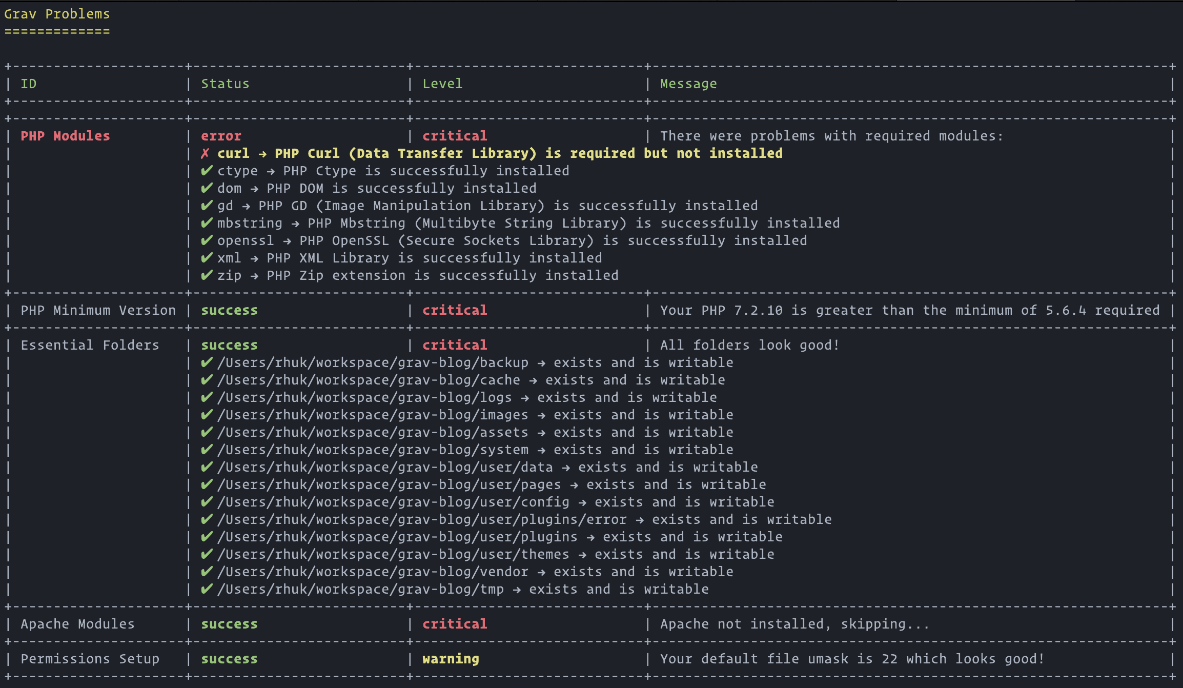 | PHP Version | PHP version being run by the server meets or exceeds Grav's minimum requirements. |